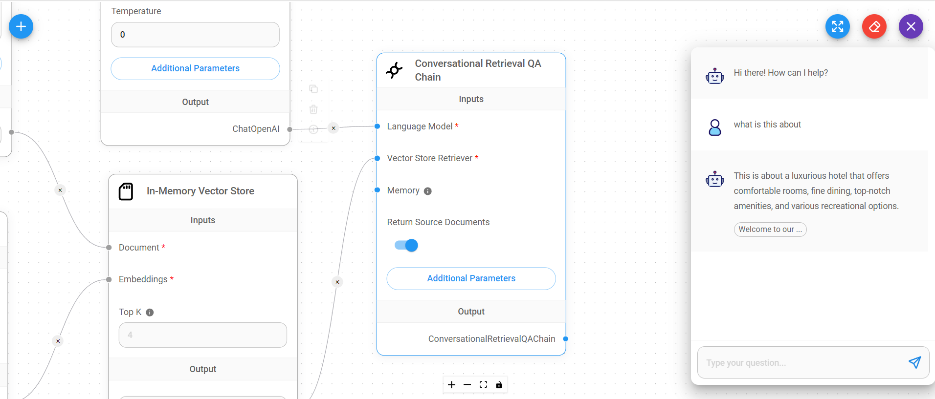 | ConversationalRetrievalQAChain | Final node to return response |