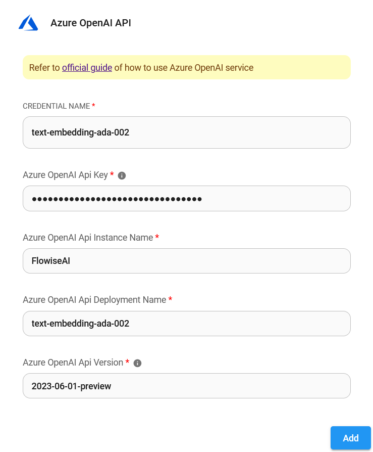 - Copy & Paste each details (API Key, Instance & Deployment name, API Version) into Azure OpenAI Embeddings credential
