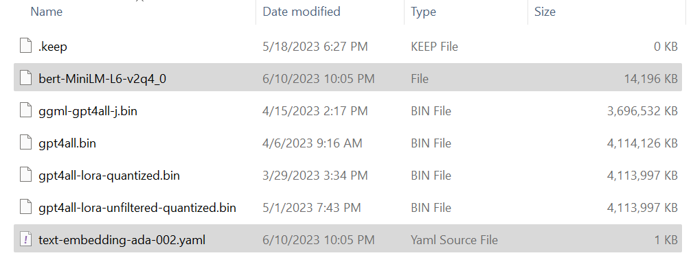 /modelsfolder of LocalAI directory. For instance:text-embedding-ada-002