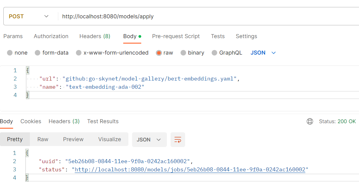cd LocalAI - LocalAI provides an API endpoint to download/install the model. In this example, we are going to use BERT Embeddings model: