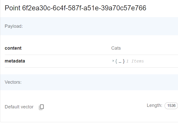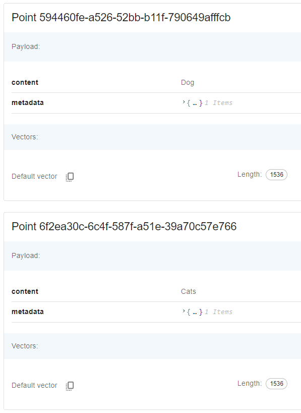 - The remaining vector embeddings in Vector Store are Cats and Dog