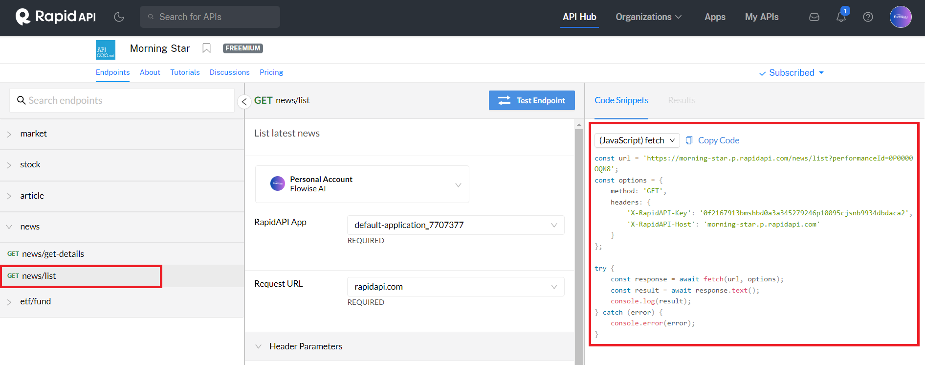 /news/listAPI to get the data. First you have to click Subscribe to Test if you haven't already, then copy the code and paste it into JavaScript Function.- Add