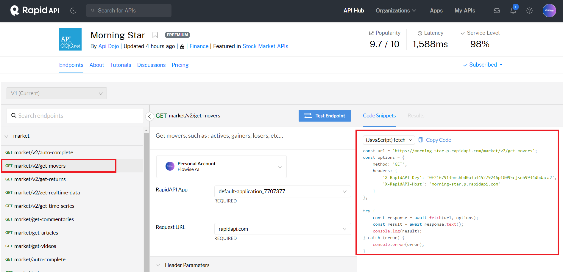 /market/v2/get-moversAPI to get data. First you have to click Subscribe to Test if you haven't already, then copy the code and paste it into JavaScript Function.- Add