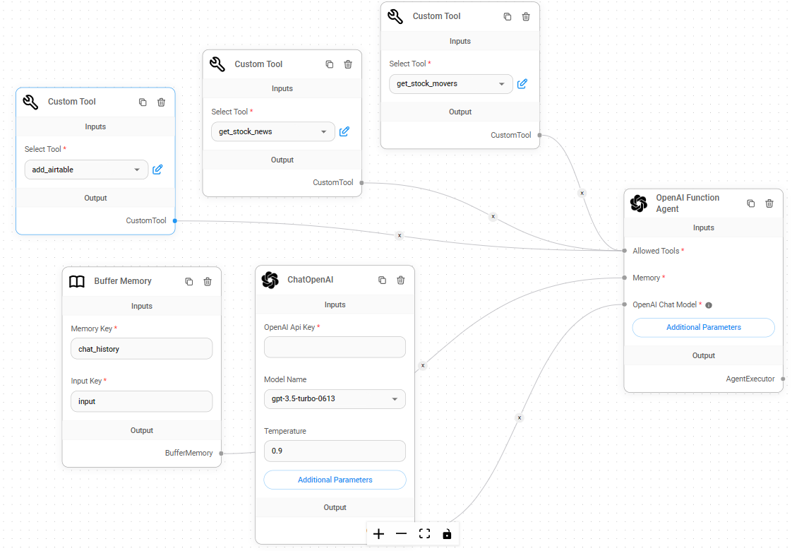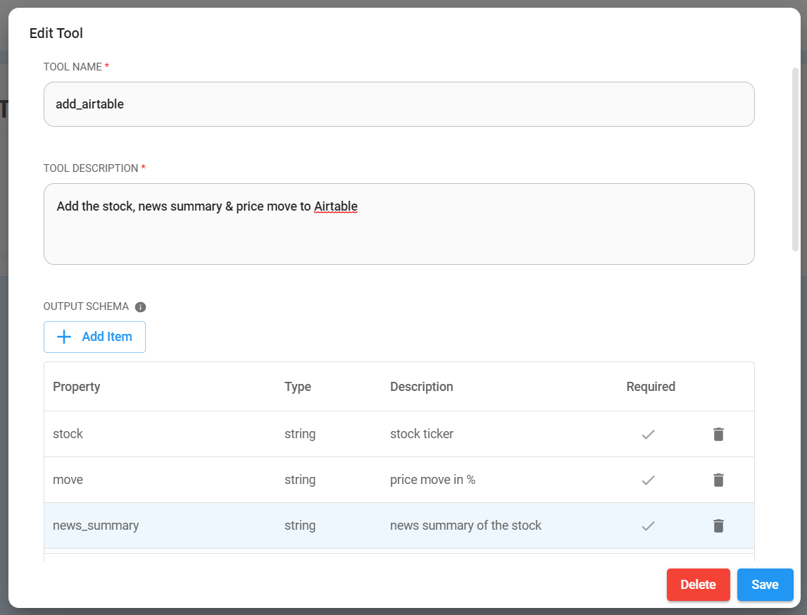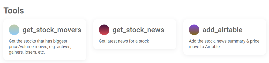 Goal: Have the agent automatically get the stock price movement, retrieve related stock news, and add a new record to Airtable.