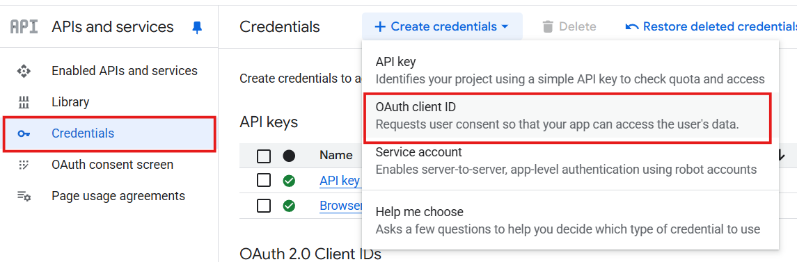 - Go to Credentials, then click + CREATE CREDENTIALS > OAuth client ID.