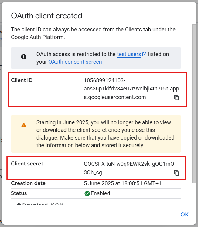 - Return to Credentials, click the newly created credential under OAuth 2.0 Client IDs, and on the detail page, you’ll find the Client ID and Client Secret.