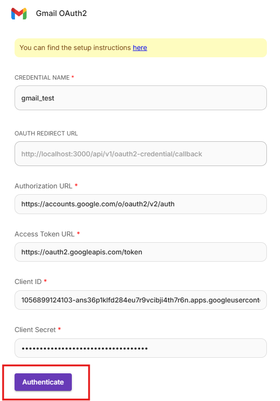 - Fill in all the values copied earlier. Then click "Authenticate":