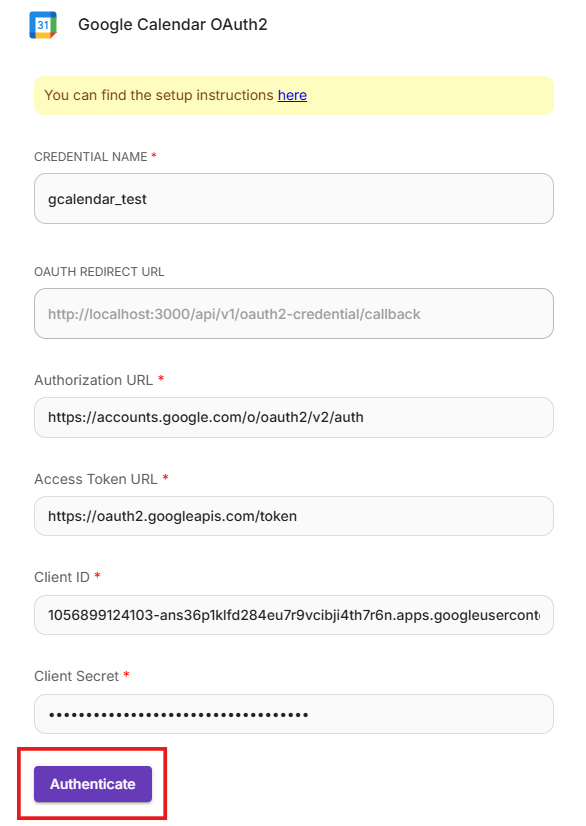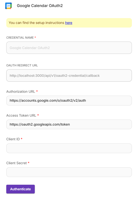 - Add a new Google Calendar OAuth2 credential