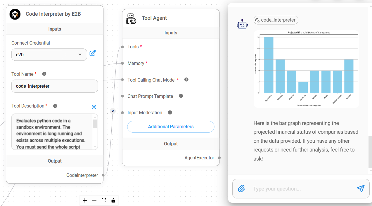 E2B is an open-source runtime for executing AI-generated code in secure cloud sandboxes. For example, when user asks to generate a bar graph of the data, LLM will output python code needed to plot the graph. This generated code will be sent to E2B, and the output of the execution will contains images of the graph, codes, text and etc. These outputs are sent back to LLM for final processing before getting displayed on the chat.
