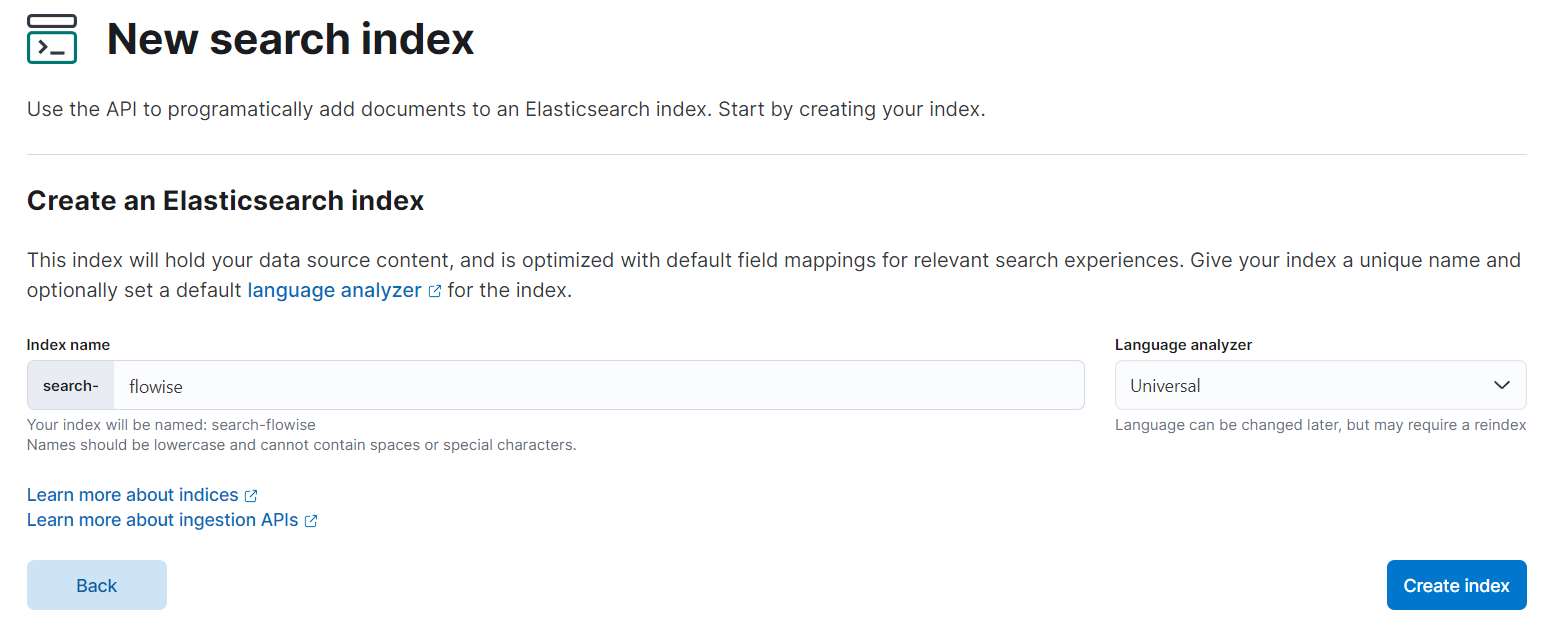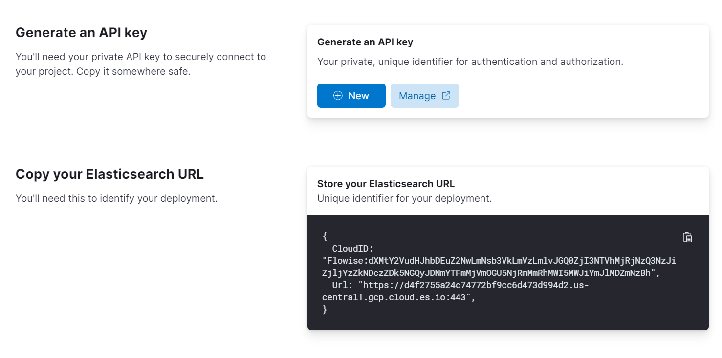 After the index has been created, generate a new API key, take note of both generated API key and the URL