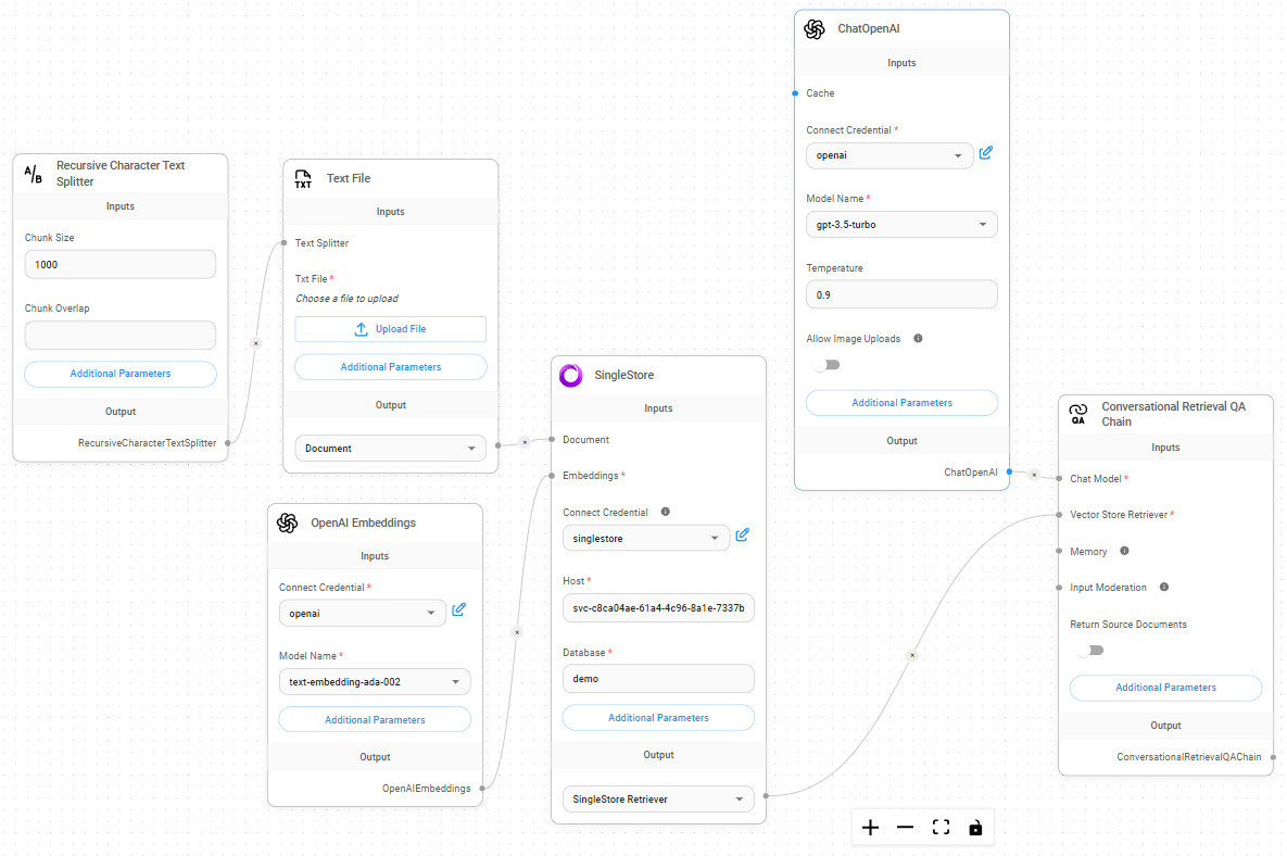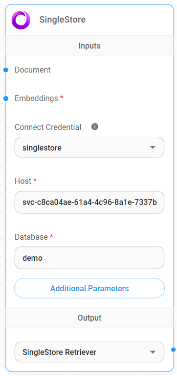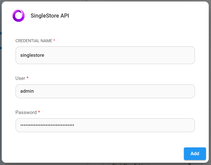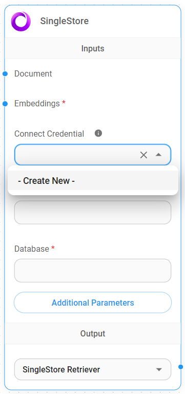 Back to CiniterFlow canvas, drag and drop SingleStore nodes. Click Create New from the Credentials dropdown: