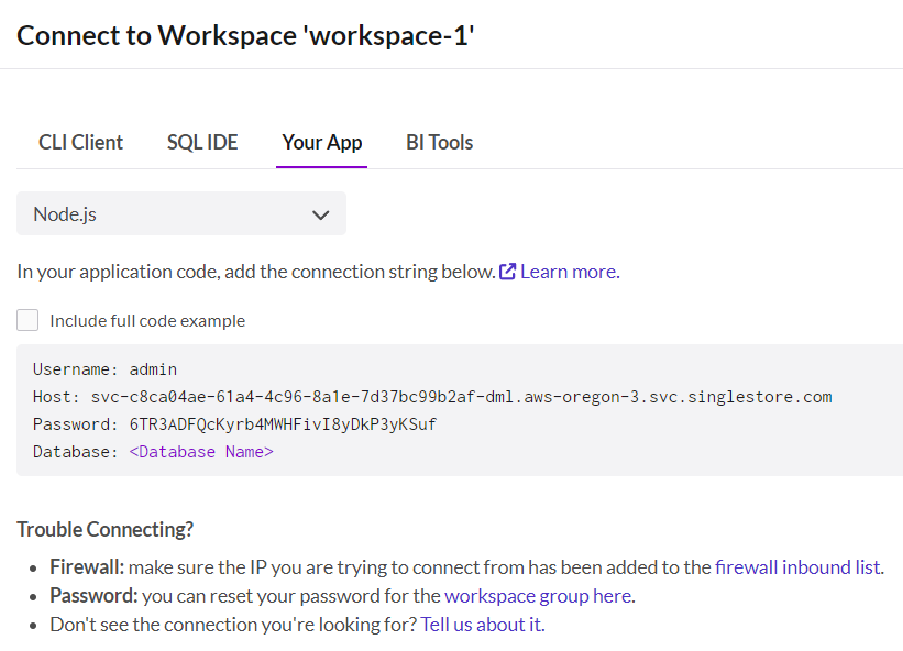 On the tabs, switch to Your App, and select Node.js from the dropdown. Take note/save the Username, Host, Password as you will need these in CiniterFlow later.