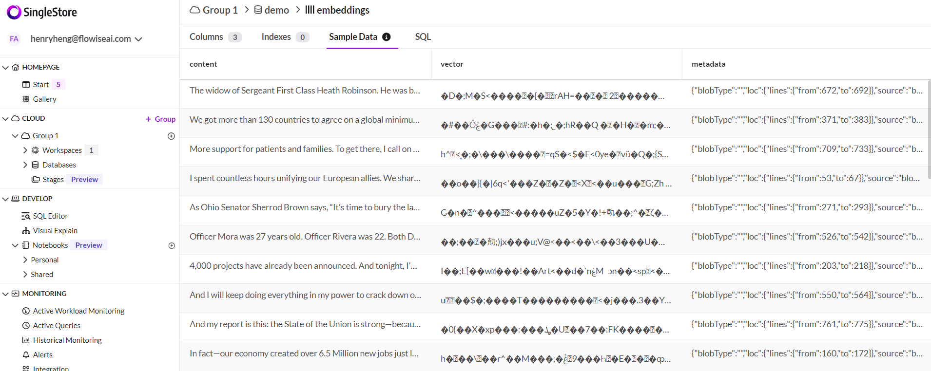 Navigate back to SingleStore portal, and to your database, you will be able to see all the data that has been upserted: