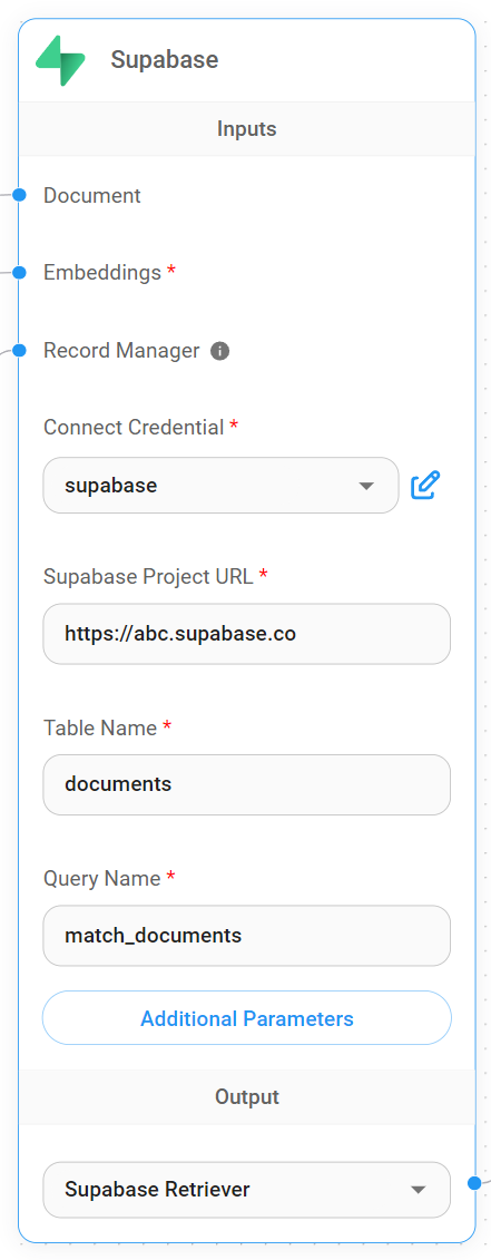 - Copy and Paste each details (API Key, URL, Table Name, Query Name) into Supabase node