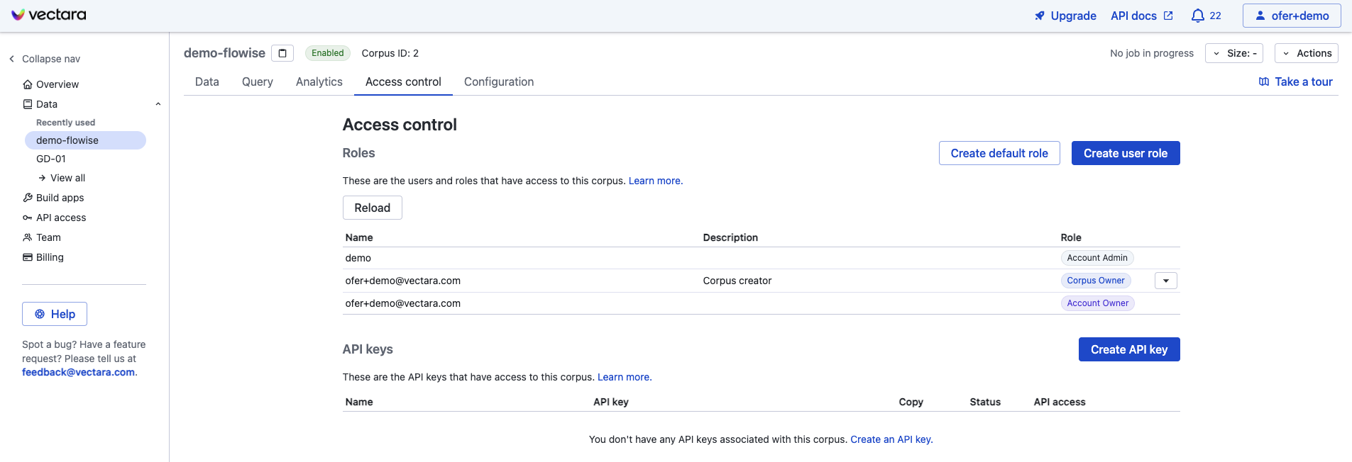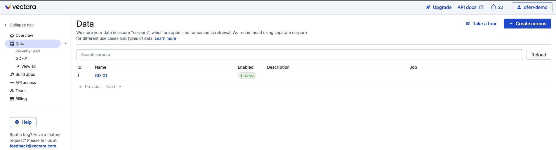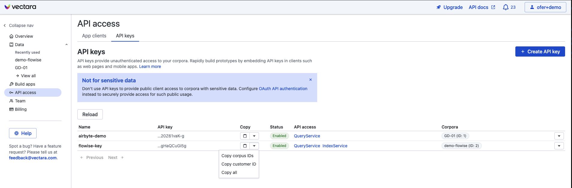 - Get your Corpus ID, API Key, and Customer ID by clicking the down-arrow under "copy" for your new API key: