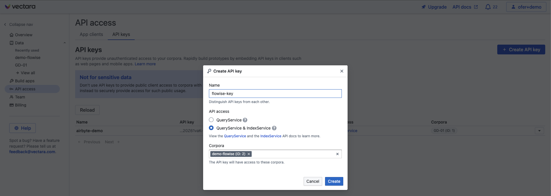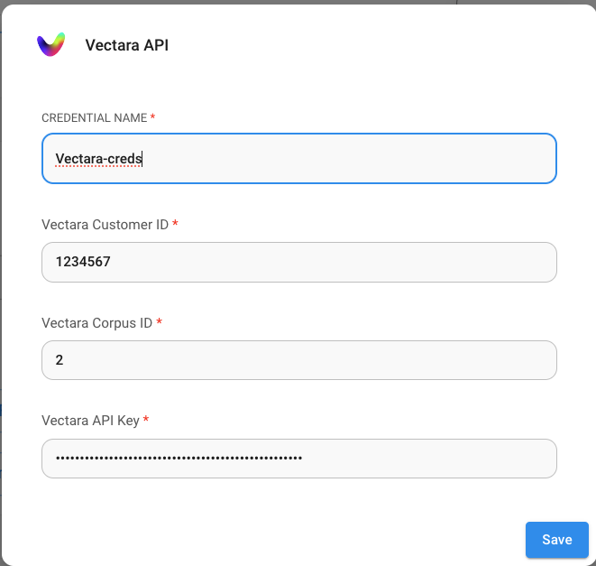 - Back to CiniterFlow canvas, and create your chatflow. Click Create New from the Credentials dropdown ane enter your Vectara credentials.