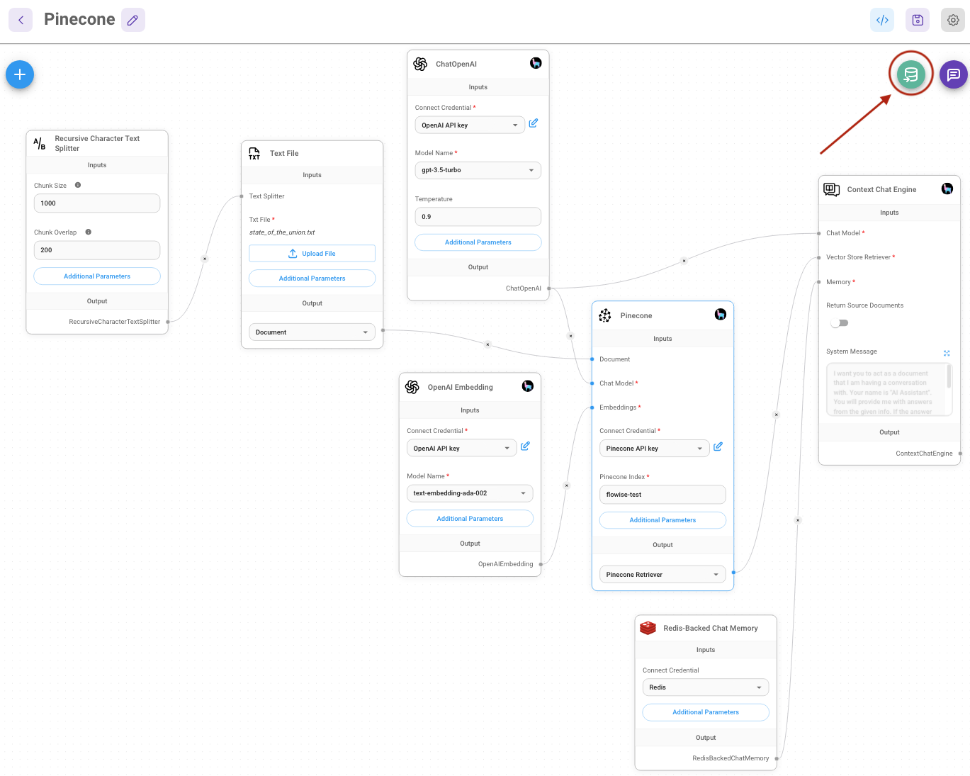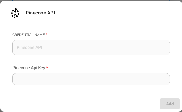 - Add a new Pinecone node to canvas and fill in the parameters: