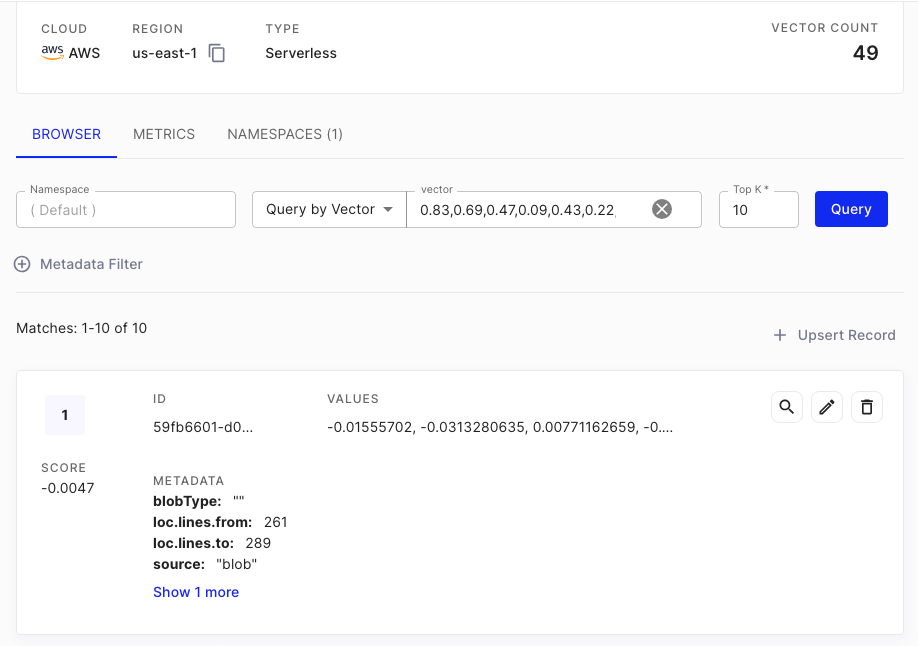 - Verify on Pinecone dashboard that data has been successfully upserted: