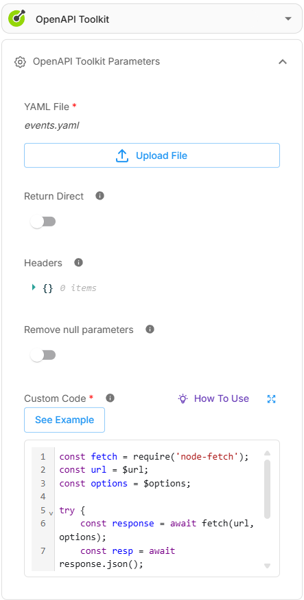 The 4 Requests tools work great if you have a couple of APIs, but imagine having tens or hundreds of APIs, this could become hard to maintain. To solve this problem, CiniterFlow provides an OpenAPI toolkit which is able to take in an OpenAPI YAML file, and parse each API into a tool. The OpenAPI Specification (OAS) is a universally accepted standard for describing the details of RESTful APIs in a format that machines can read and interpret.