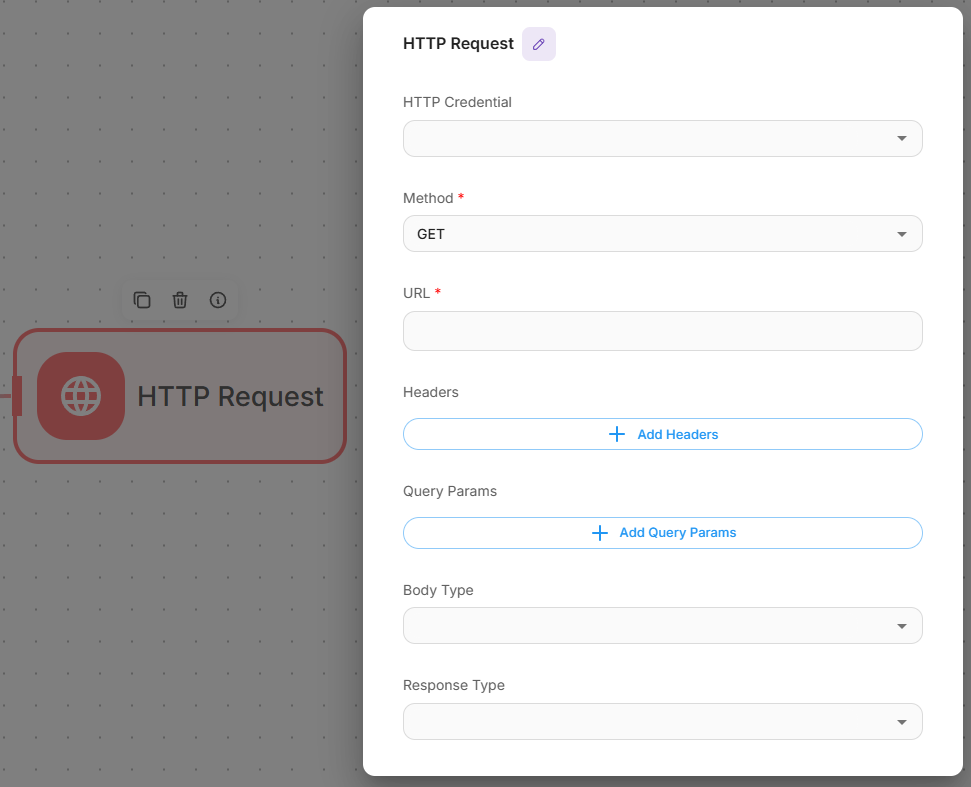 From the examples above, we’ve seen how the Agent can dynamically call tools and interact with APIs. In some cases, it may be necessary to call an API sequentially before or after certain actions. For instance, you might fetch a customer list from a CRM and pass it to an Agent. In such cases, you can use the HTTP node.