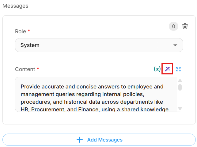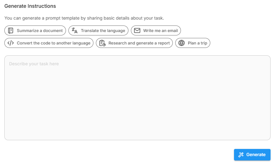 - Add a system prompt, or use the Generate button to assist. We recommend using it, as it helps craft a more effective and optimized prompt.