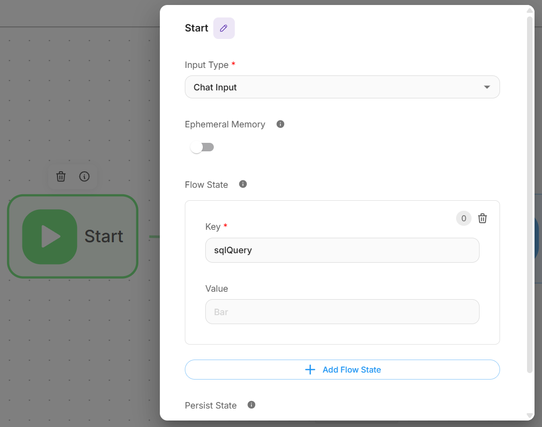 The Start node initializes the flow state with an empty sqlQuery variable that will store the generated SQL query throughout the process.