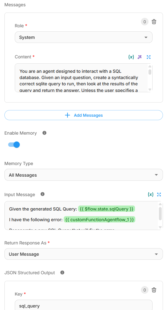 This SQL Agent flow provides a robust, self-correcting system for database interactions that can handle SQL queries in natural language.
