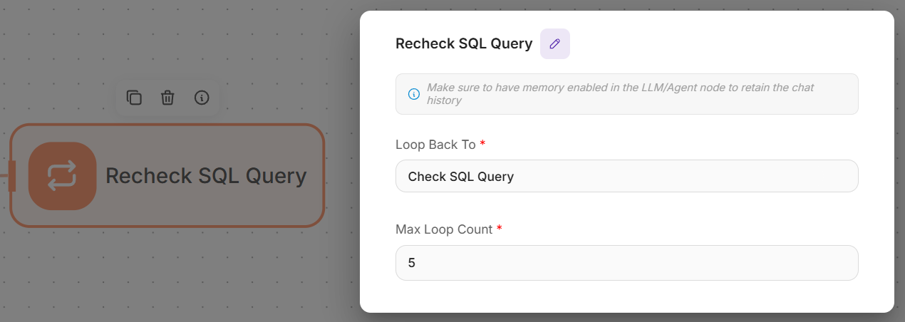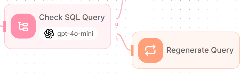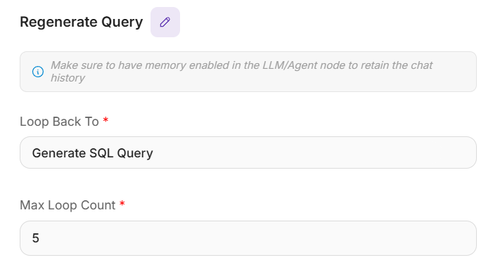 Add a Loop node connected to the "Regenerate SQL Query" LLM.