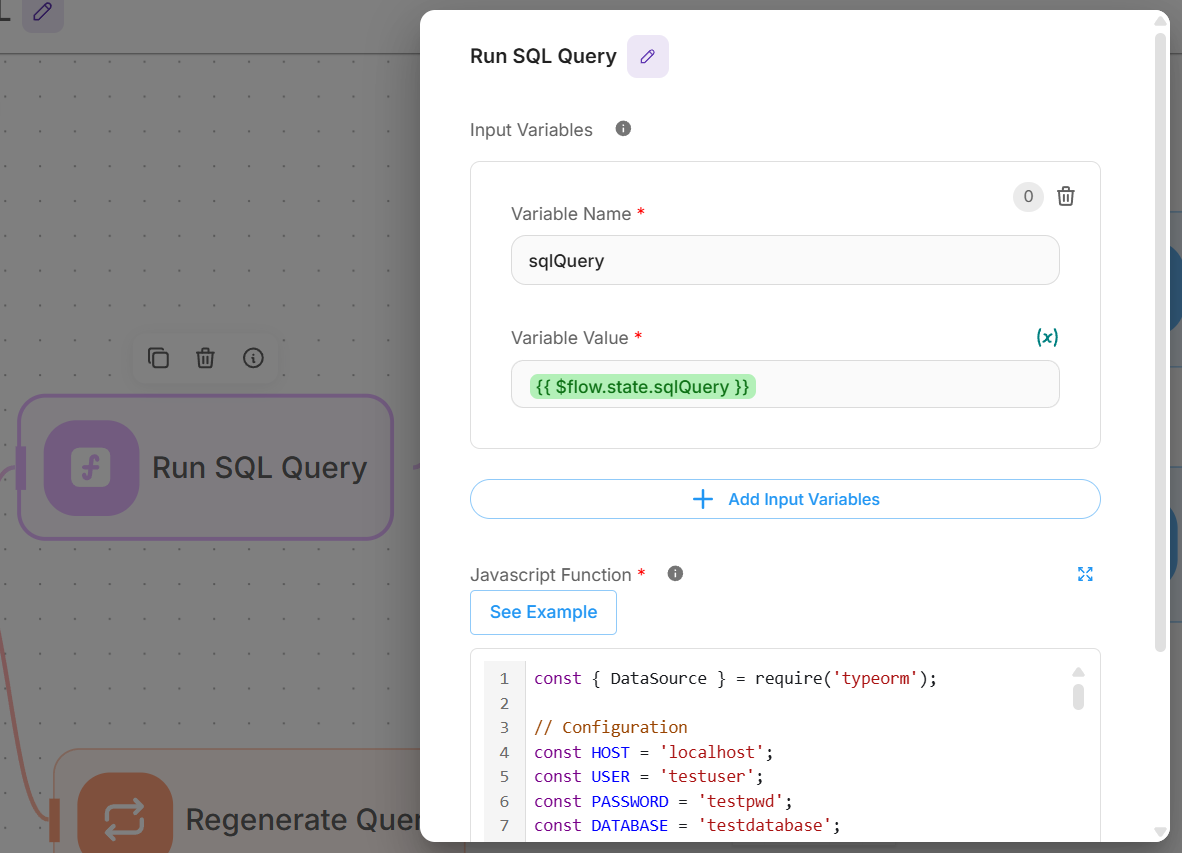- Input Variables: Here we pass in the generated SQL query as variable to be used in Function.