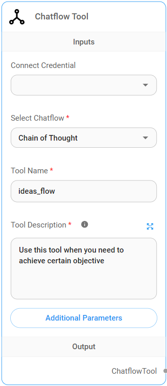 - Create another chatflow with Tool Agent + Chatflow Tool. Select the chatflow you want to call from the tool. In this case, it was Chain of Thought chatflow. Give it a name, and an appropriate description to let LLM knows when to use this tool: