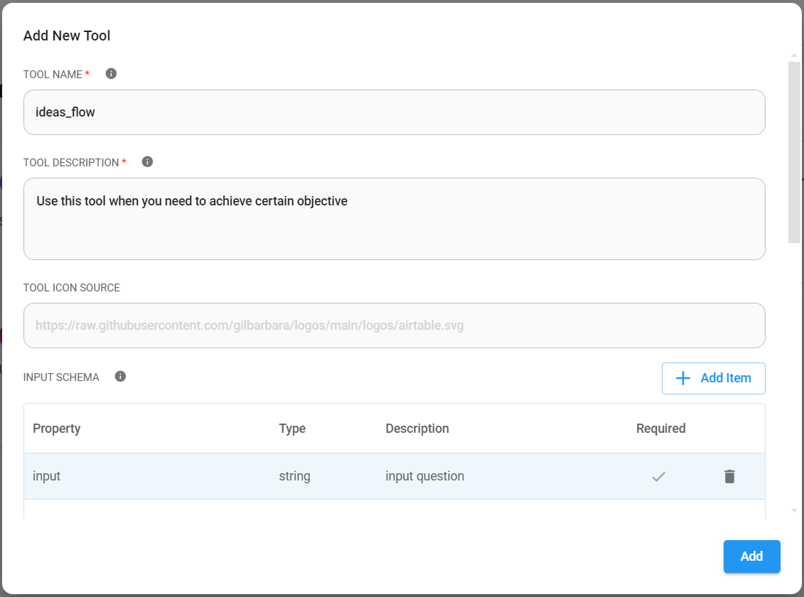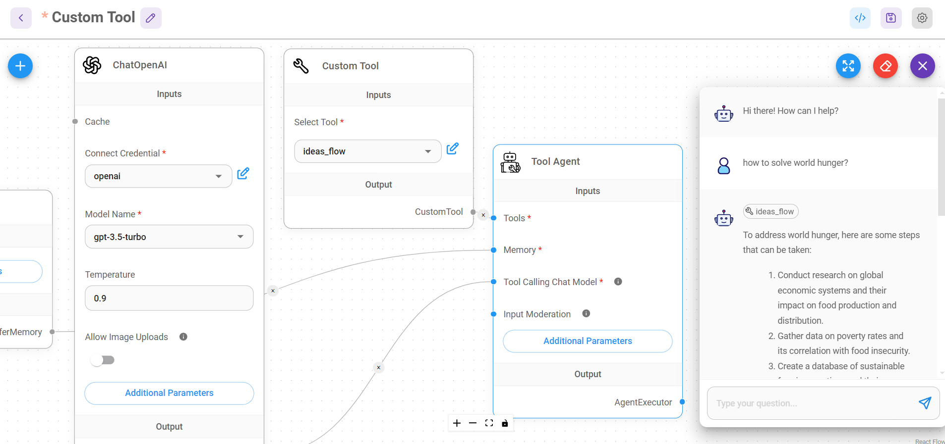- Create a Tool Agent + Custom Tool. Specify the tool we've created in Step 1 in the Custom Tool.