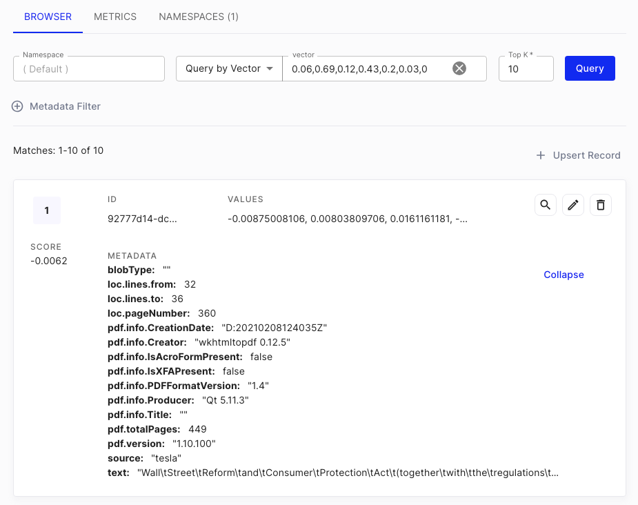 - On the Pinecone console you will be able to see the new vectors that were added.