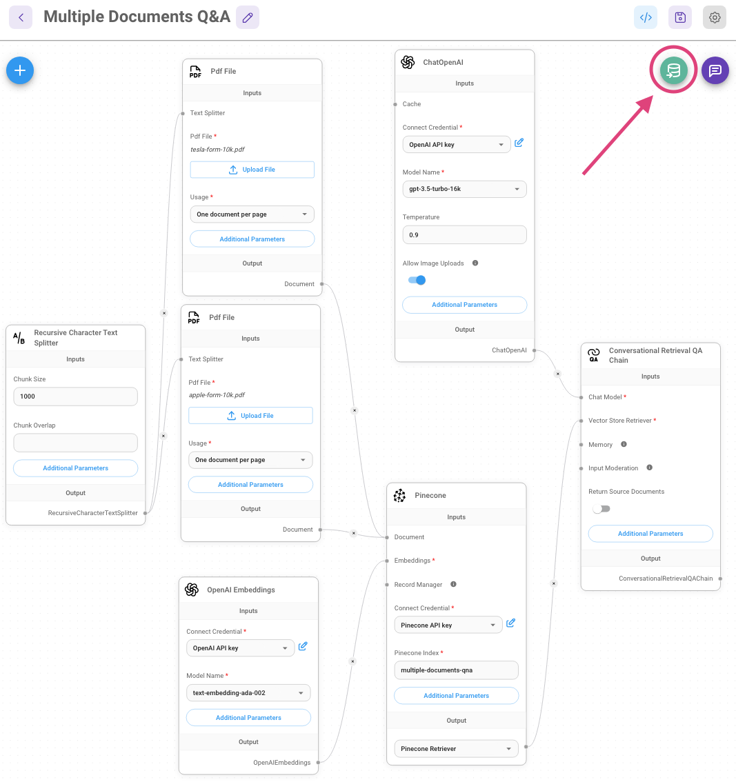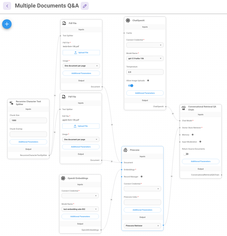 - Click the Additional Parameters of PDF File Loader, and specify metadata object. For instance, PDF File with Apple FORM-10K uploaded can have a metadata object
