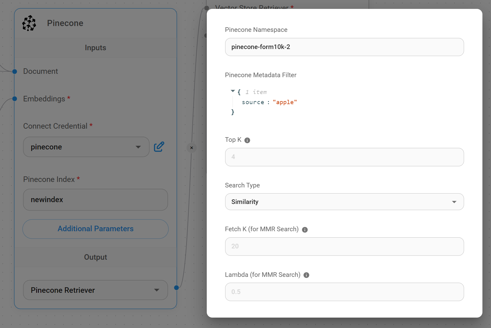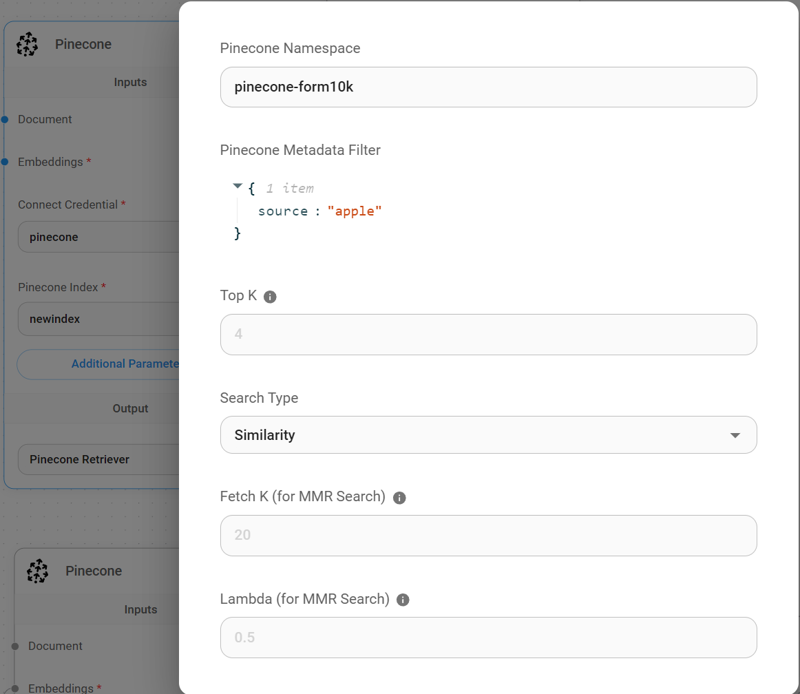 - We can fix this by specifying a metadata filter from the Pinecone node. For example, if we only want to retrieve context from APPLE FORM-10K, we can look back at the metadata we have specified earlier in the #upsert step, then use the same in the Metadata Filter below: