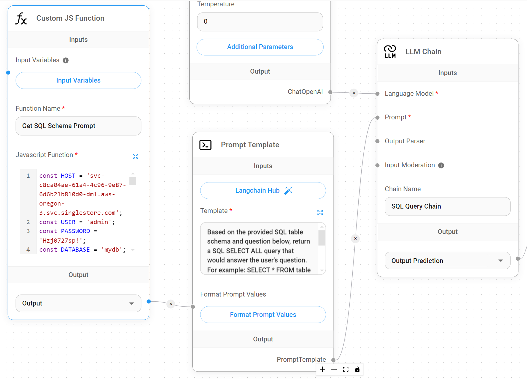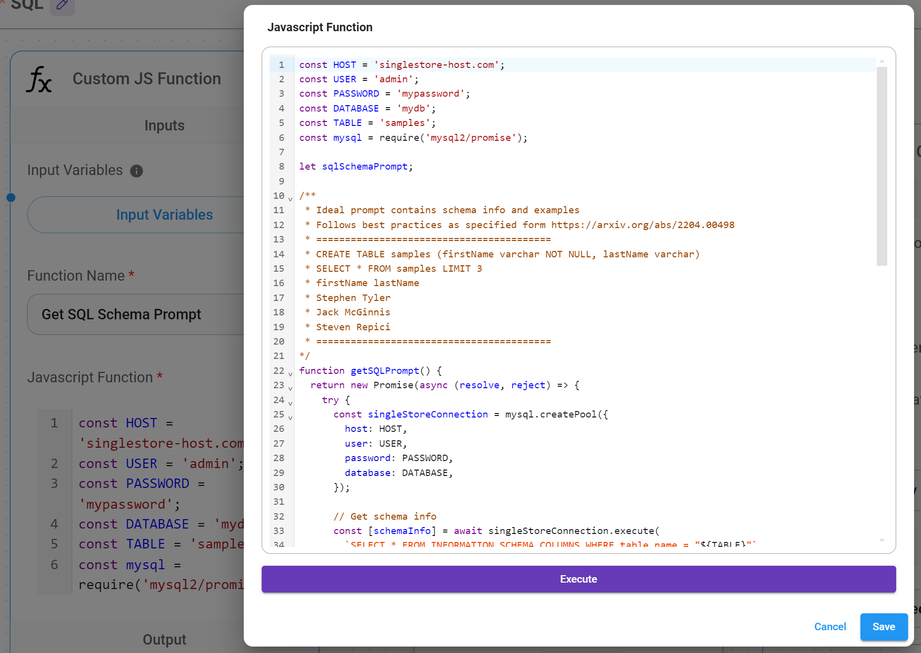 Use a Custom JS Function node to connect to SingleStore, retrieve database schema and top 3 rows.