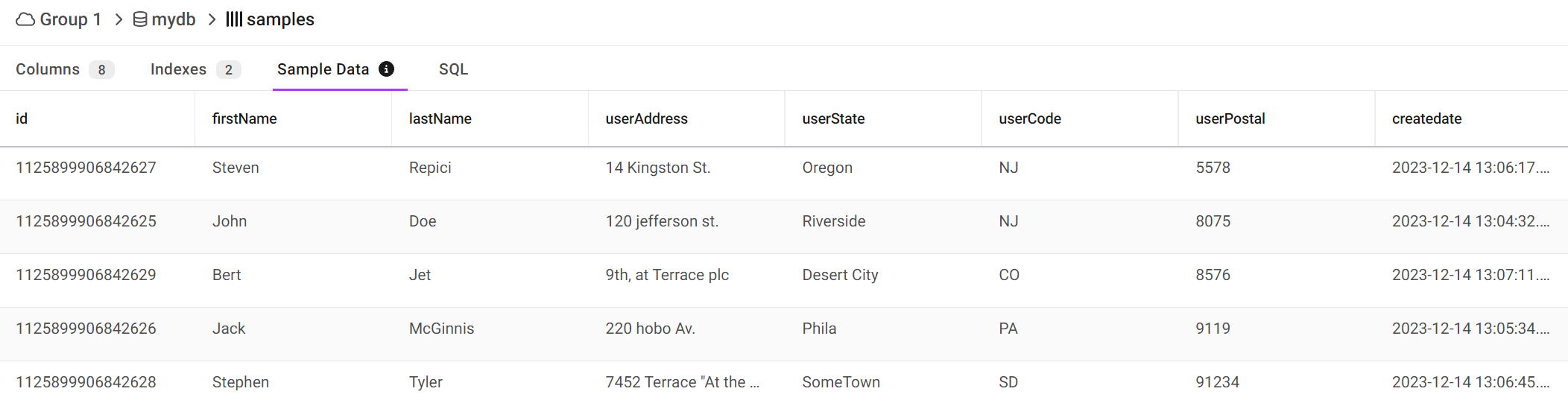 CREATE TABLE samples (firstName varchar NOT NULL, lastName varchar)