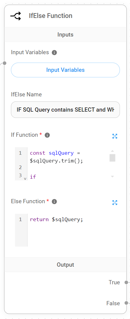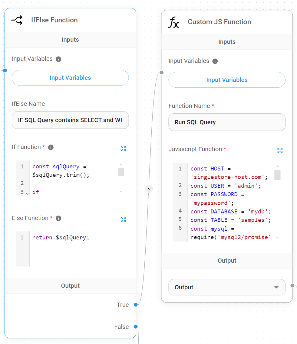 If it is a valid SQL query, we need to execute the query. Connect the True output from If Else node to a Custom JS Function node: