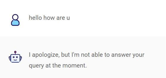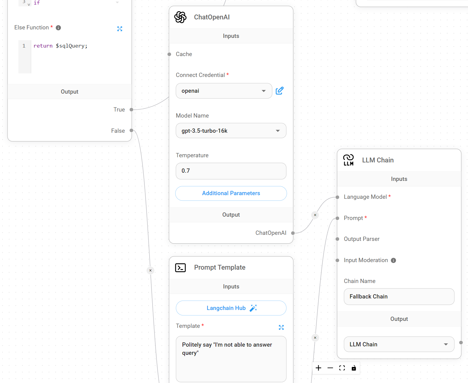 In the Else Function, we will route to a Prompt Template + LLMChain that basically tells LLM that it is unable to answer user query: