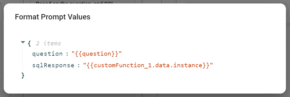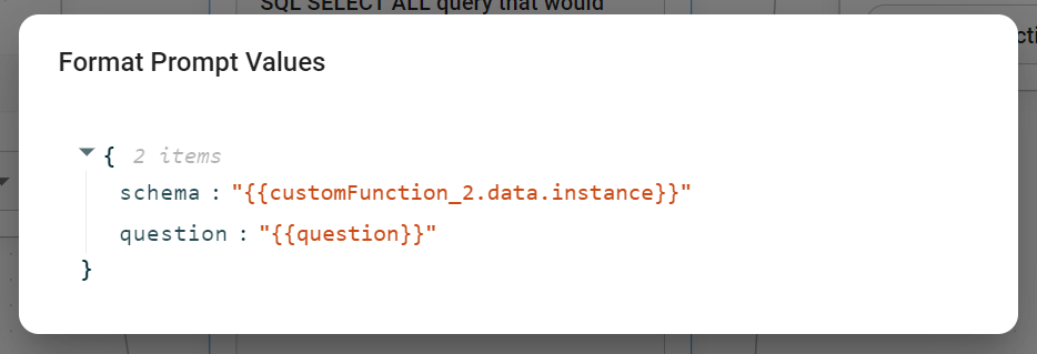 Since we are using 2 variables: {schema} and {question}, specify their values in Format Prompt Values: