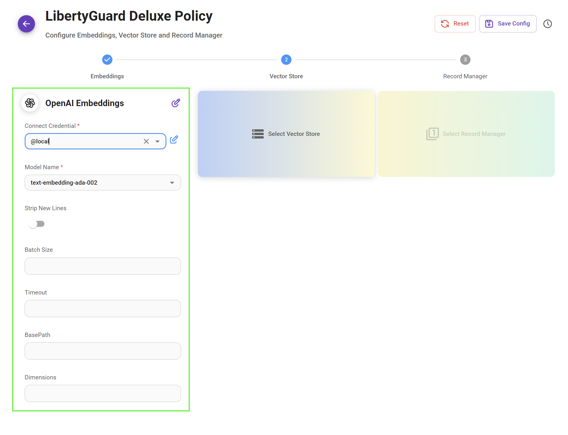 Click on the "Select Embeddings" card and choose your preferred embedding model. In our case, we will select OpenAI as the embedding provider and use the text-embedding-ada-002 model with 1536 dimensions.