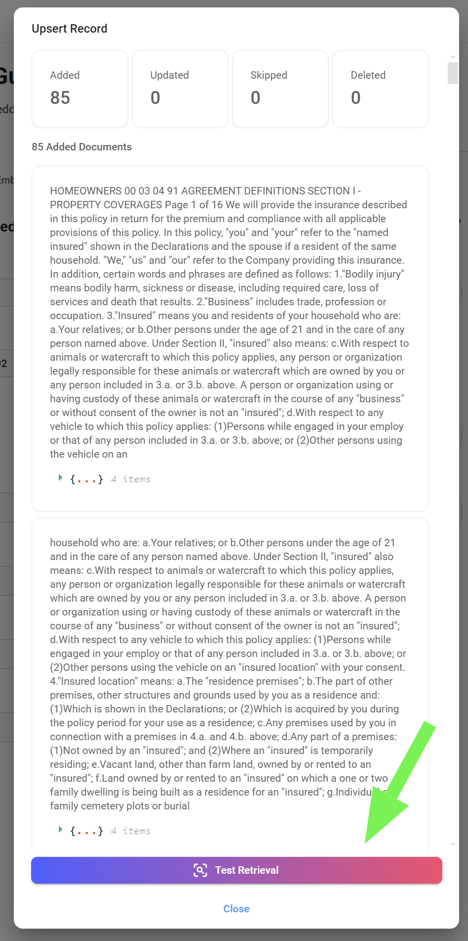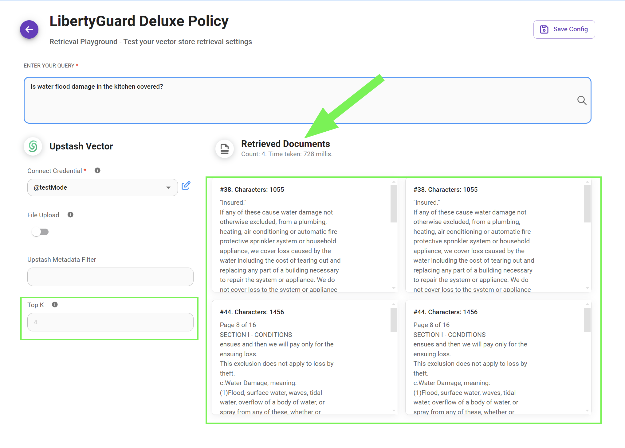 In our case, we see that when querying for information about kitchen flooring coverage in our insurance policy, we retrieve 4 relevant chunks from Upstash, our designated Vector Store. This retrieval is limited to 4 chunks as per the defined "top k" parameter, ensuring we receive the most pertinent information without unnecessary redundancy.
