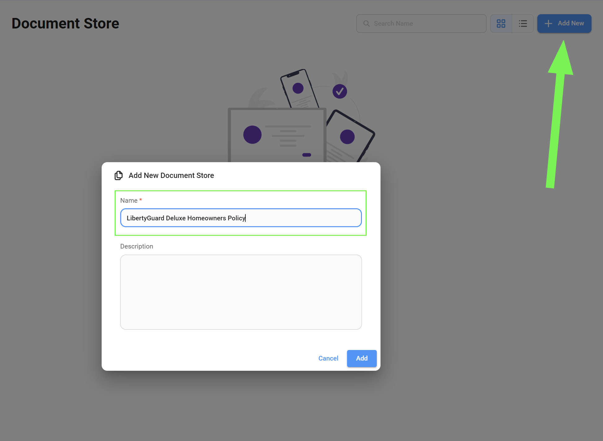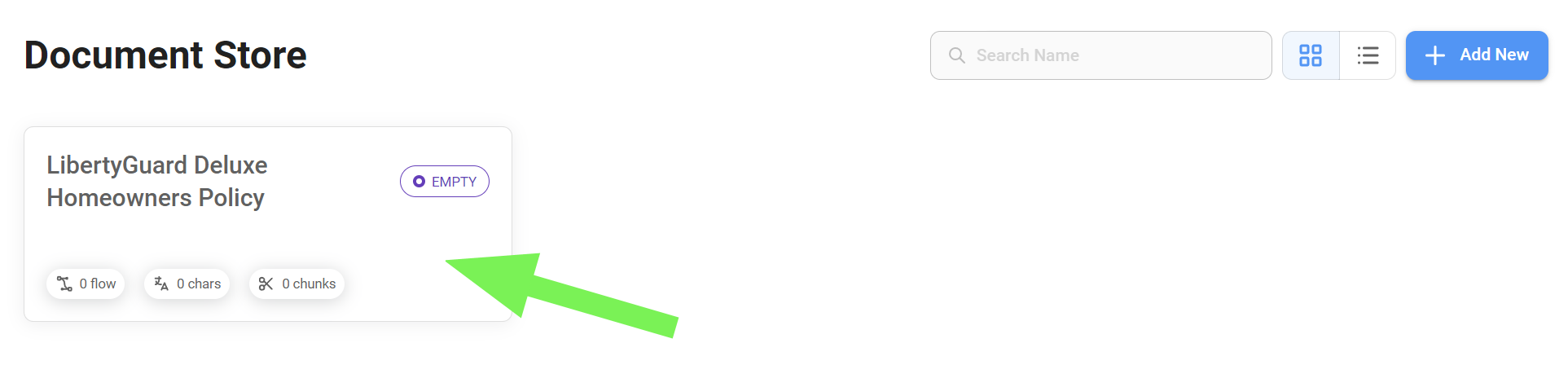 Start by adding a Document Store and naming it. In our case, "LibertyGuard Deluxe Homeowners Policy".
