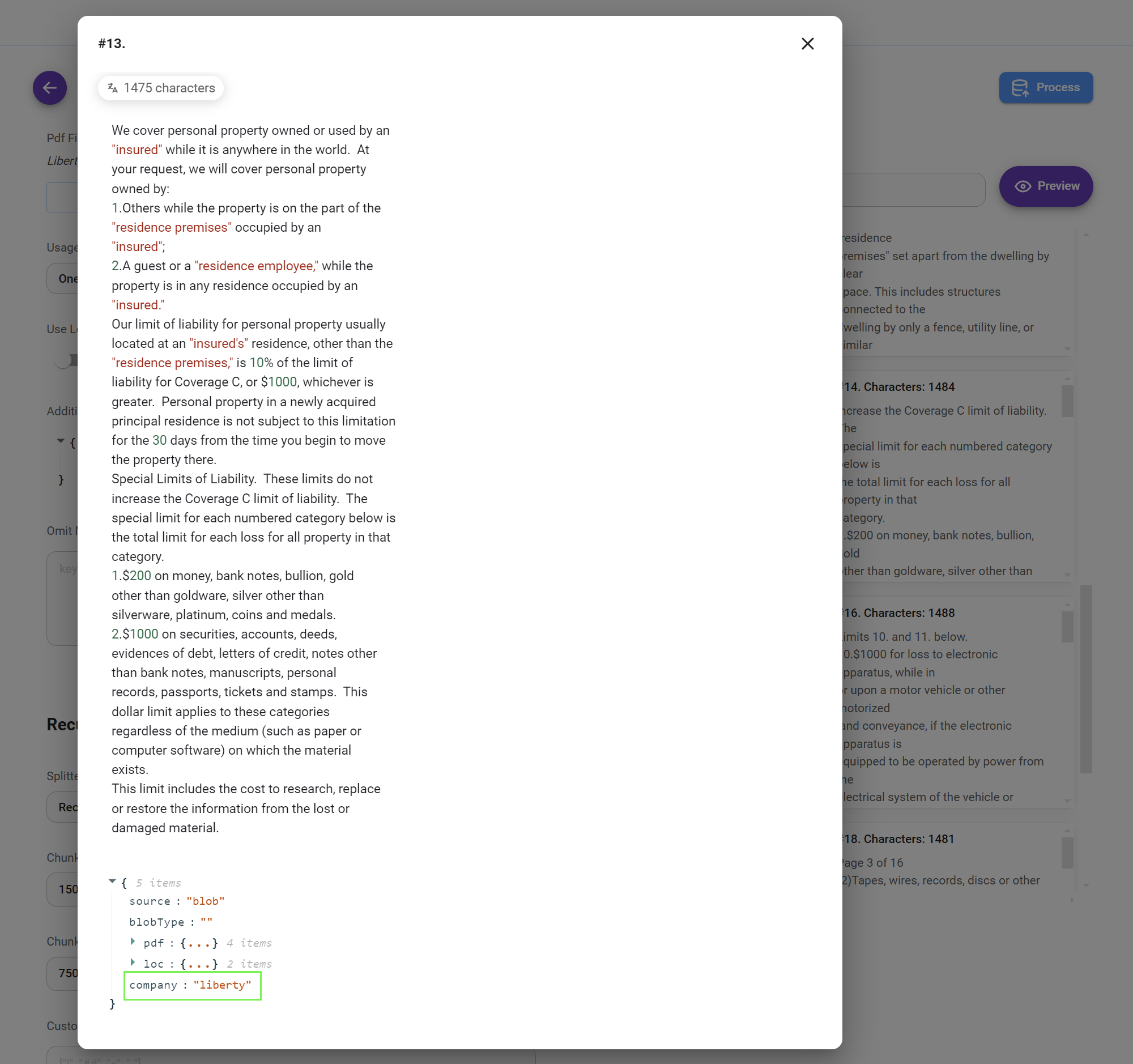 Note that our custom metadata company: "liberty" has been inserted into each chunk. This metadata allows us to easily filter and retrieve information from this specific dataset later on, even if we use the same vector store index for other datasets.