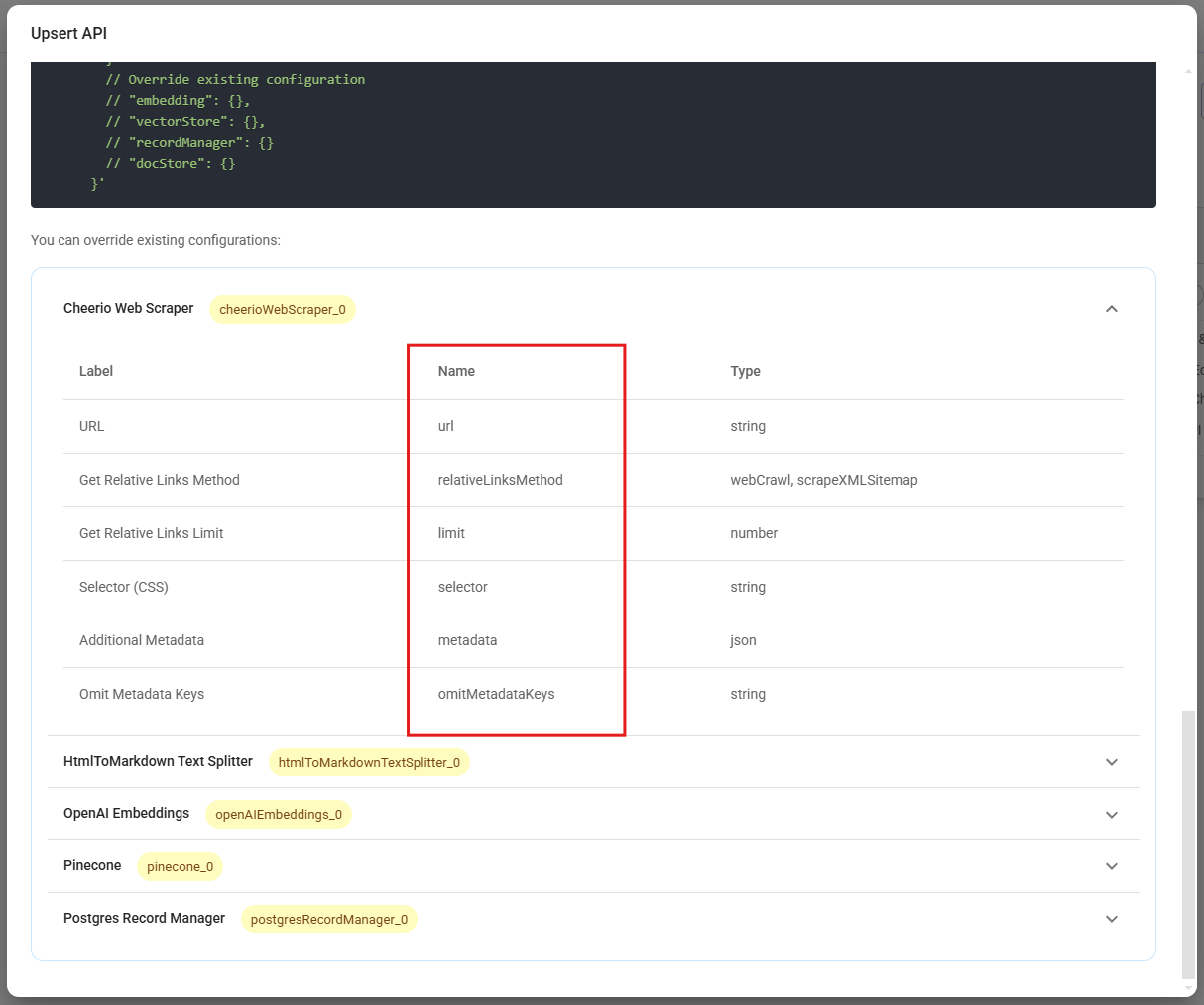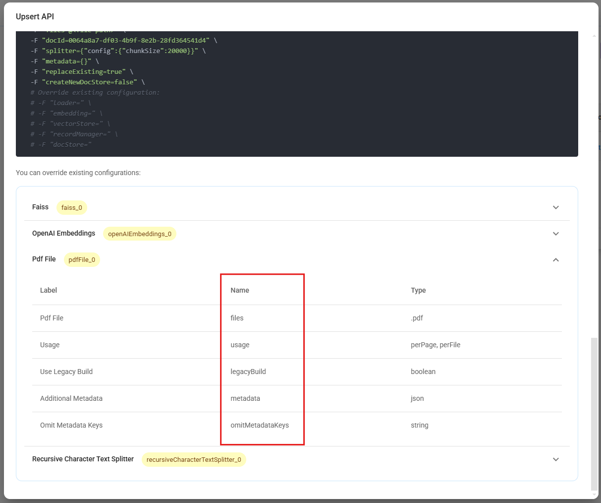 For other Document Loaders nodes without Upload File functionality, the API body is in JSON format: