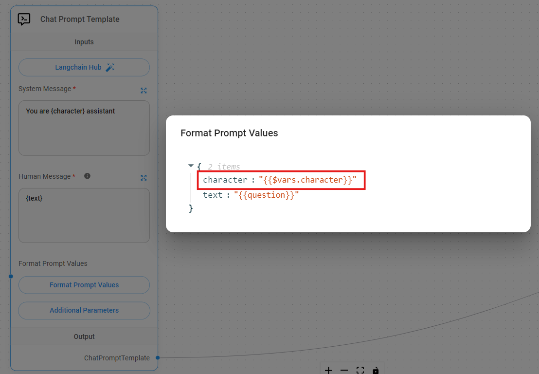 Variables can be used by the nodes in CiniterFlow. For instance, a variable named character is created: